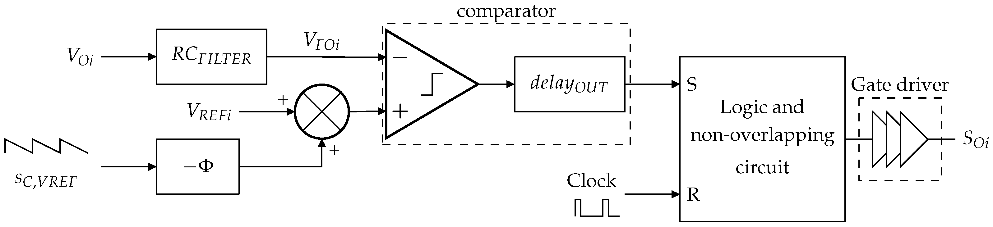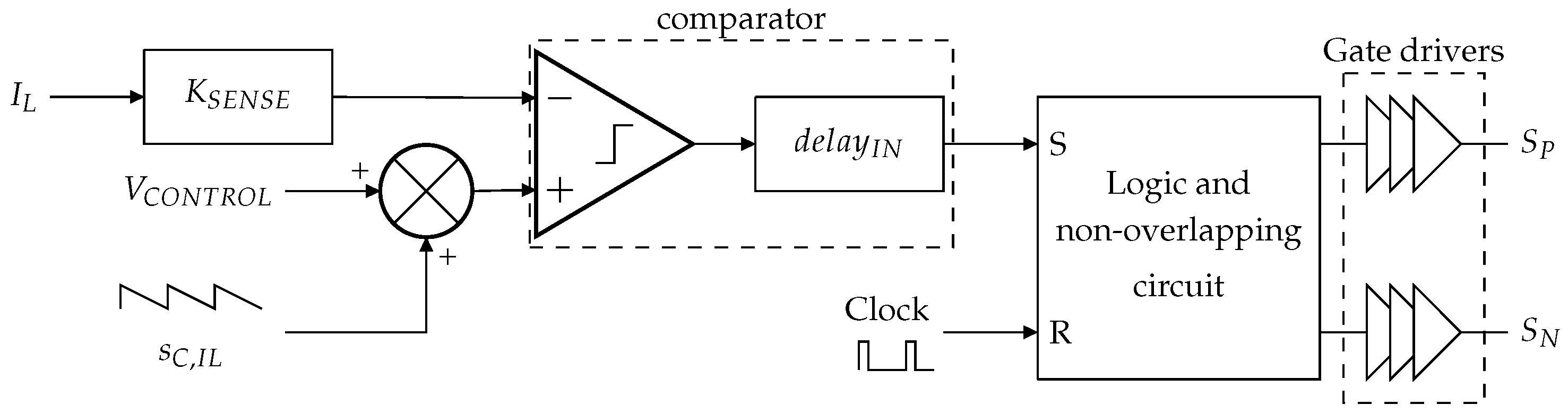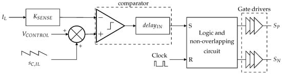The image voltage of the sensed inductor current, ·, with the current sensor gain, is compared to the sum of a negative slope compensating ramp, , and the error amplifier output voltage, . For simplicity in the analysis, the comparator is modeled as an ideal comparator and a delay block, , representing the switching latency of a real comparator. The comparator output is forwarded to the SET input of a logic glue and a non-overlapping circuit, while the SMPS clock signal drives the RESET input. This circuit generates the command signals of the input switches, and , which are propagated through gate drivers to and , respectively.