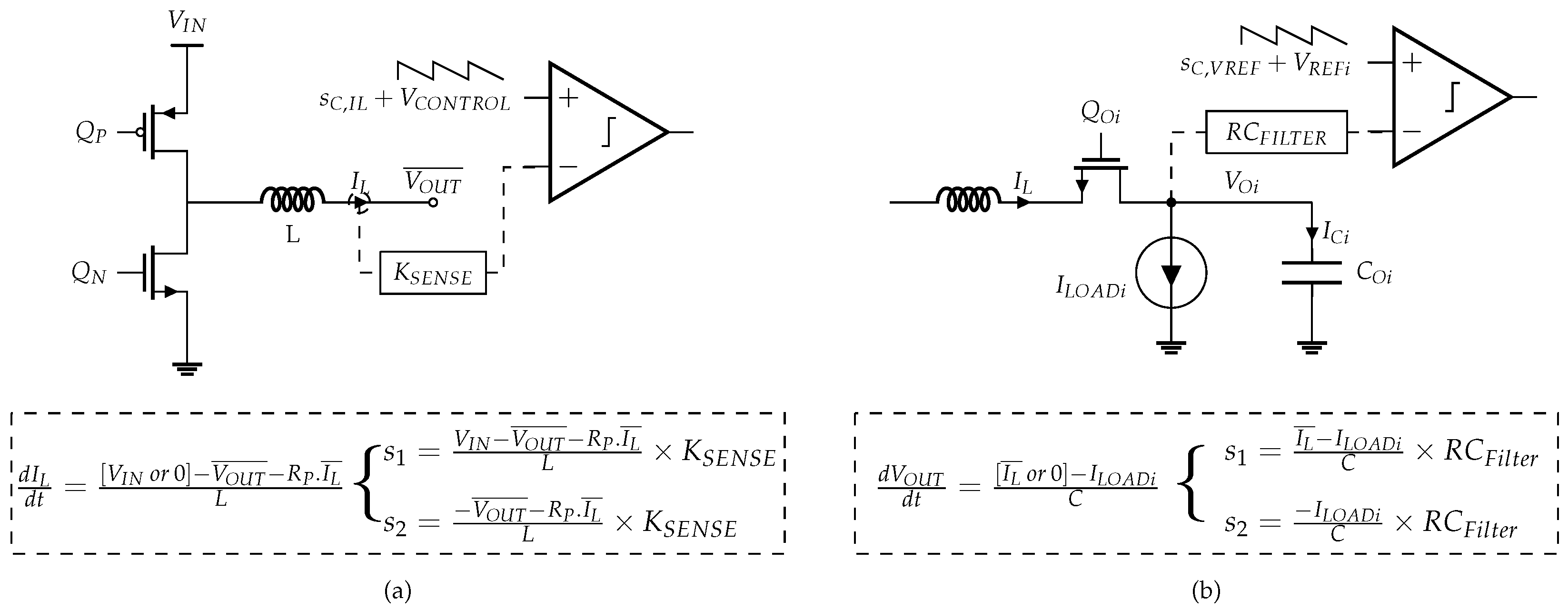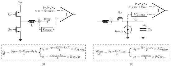 Figure 8 shows which signals from the SIMO converter power stage are compared to a reference signal plus a compensating ramp, for the input and output switches’ control loops, respectively, in Figure 8a and Figure 8b. Moreover, the expression of the slopes, and of the fed signals, are given as a function of the circuit parameters, voltages and currents.