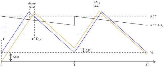 In Figure 10, the blue waveform corresponds to a signal of interest in steady-state condition, i.e., a stable pattern without sub-harmonic oscillations, while the orange waveform starts with an initial perturbation of . During each switching cycle, the signal is rising with a slope, , until it reaches its reference minus the compensating ramp of slope, . A delay, which corresponds to the comparator delay in the circuit implementation, is considered between the crossing and the start of the signal fall. The signal decreases with a slope, , until the next switching cycle starts. The time during which the signal is rising is denoted , while the switching period is denoted T. When no sub-harmonic oscillations occur, the signal in blue returns to its initial value, at the start of the next switching cycle, while the perturbed signal in orange reaches at the end of the cycle.