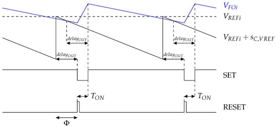 As shown in Figure 6, a phase shift, , is added between the reset of the compensating ramp and the reset of the logic glues and non-overlapping circuit, to avoid both resets at the same time. Without this phase shift, if the sensed output voltage, , becomes lower than its reference minus the slope compensation just before the logic glues and non-overlapping circuit is reset, the comparator’s propagation time, , causes an incoherence between the comparator inputs and the output fed to the logic glues. This phenomenon is highlighted in Figure 7a. The RESET of the logic glues happens while the SET is still in a high state, even if the sensed output voltage is already lower than its reference minus the compensating ramp. As a result, the output voltage will decrease during the whole next period, then it will increase again, and this phenomenon will be repeated. It causes an unwanted pattern of subharmonic oscillations. This issue is also addressed in [25].