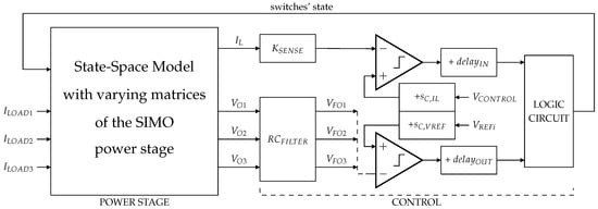 Further mathematical analyses are performed in [12,13,17,18]. Based on the discrete model of the SISO DC-DC converter, the local stability of the converter is determined by the eigenvalues of a state-space matrix. However, this methodology cannot be applied to a SIMO DC-DC converter due to the increased complexity of the system when more than one output is supplied.