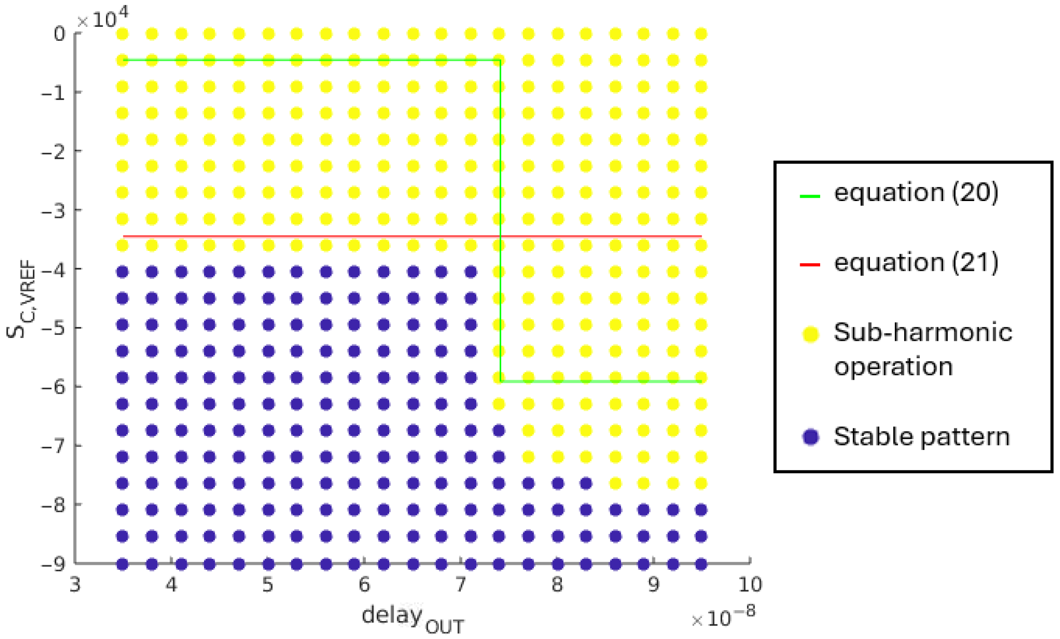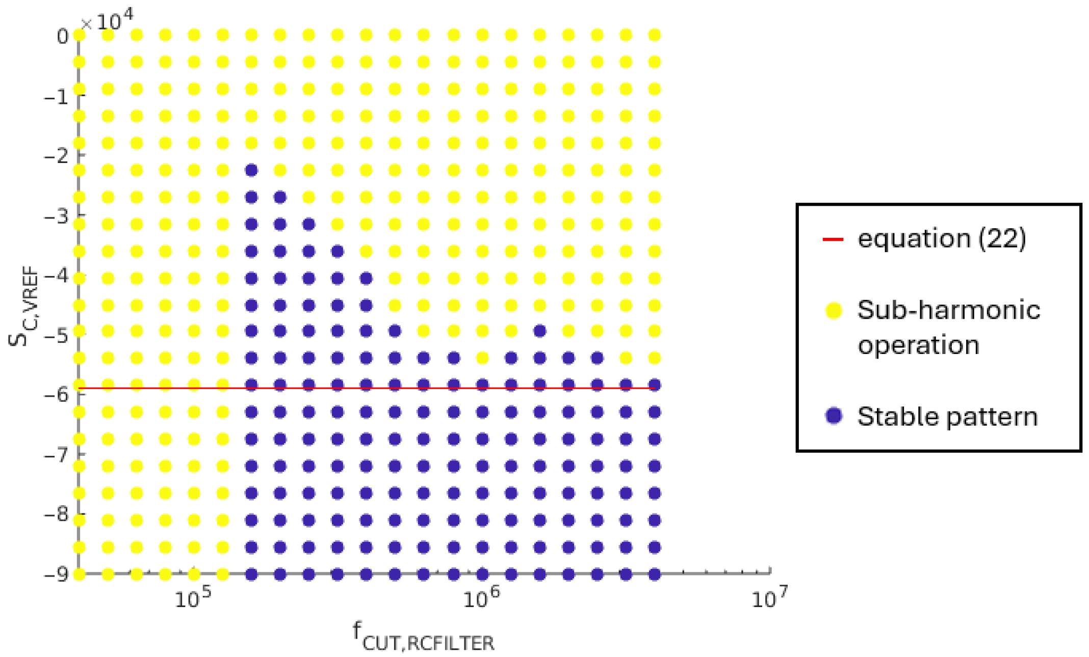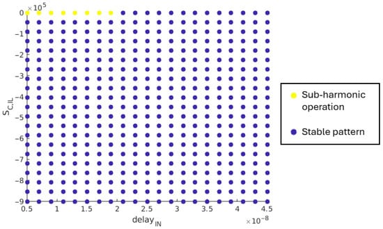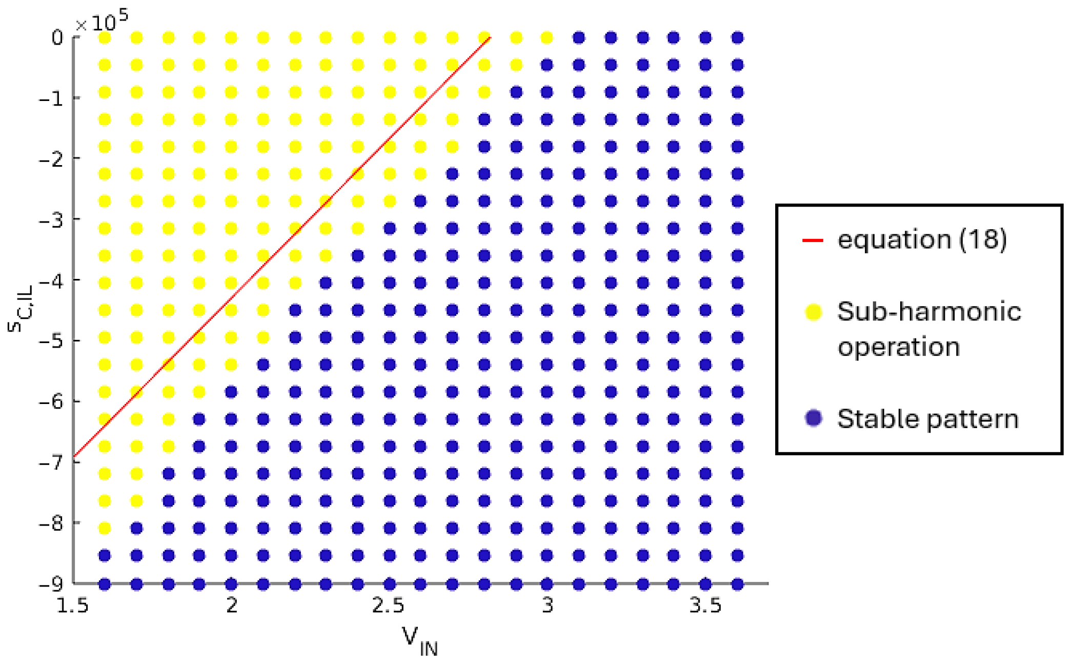 This boundary equation is verified through simulation. The supply voltage, , varies in the range [1.6 V; 3.6 V] with a 100 mV step. The compensation ramp slope, , varies between 0 V/s and 9·105 V/s. The maximum value for this slope corresponds to an amplitude of 300 mV with 3 MHz switching frequency of the SIMO converter. Figure 13 shows the obtained results. For a given set of (, ), a yellow point means that at least one load case is leading to sub-harmonic oscillations, while a blue point means that a stable operation pattern is achieved by the SIMO converter for all load cases in Table 2.