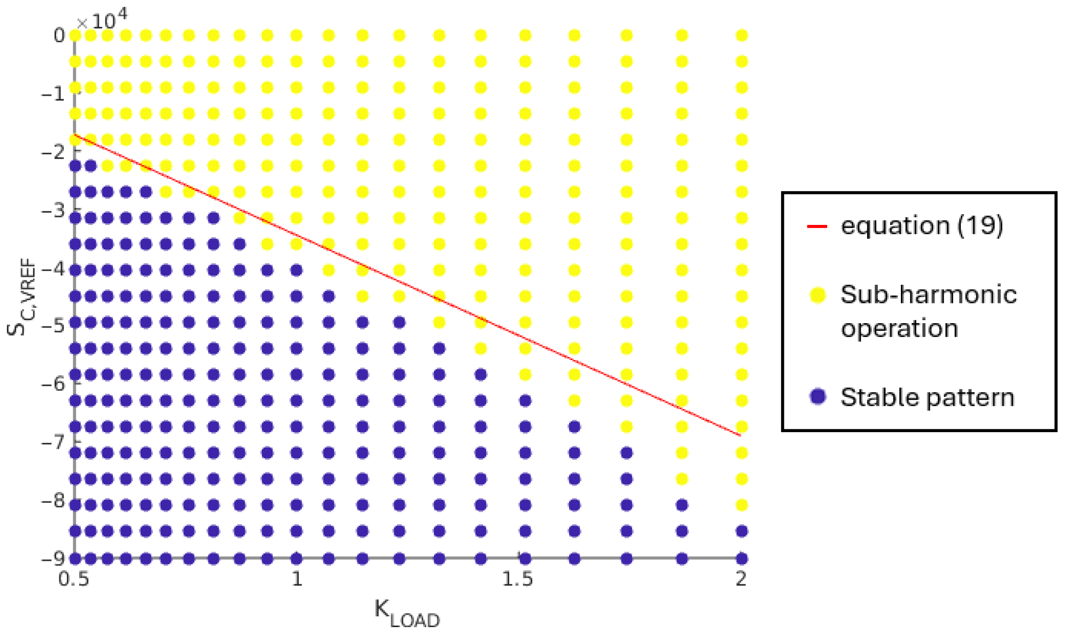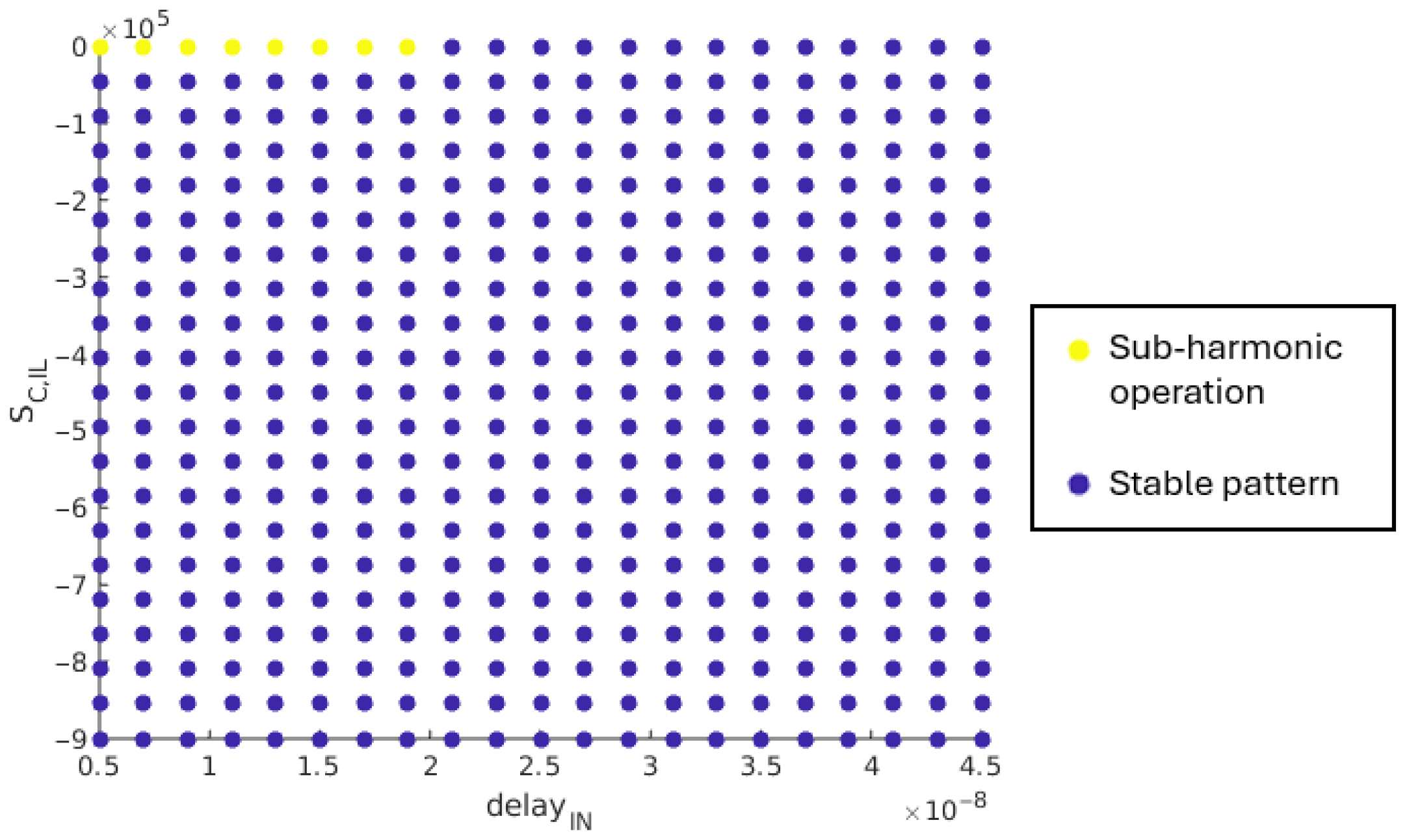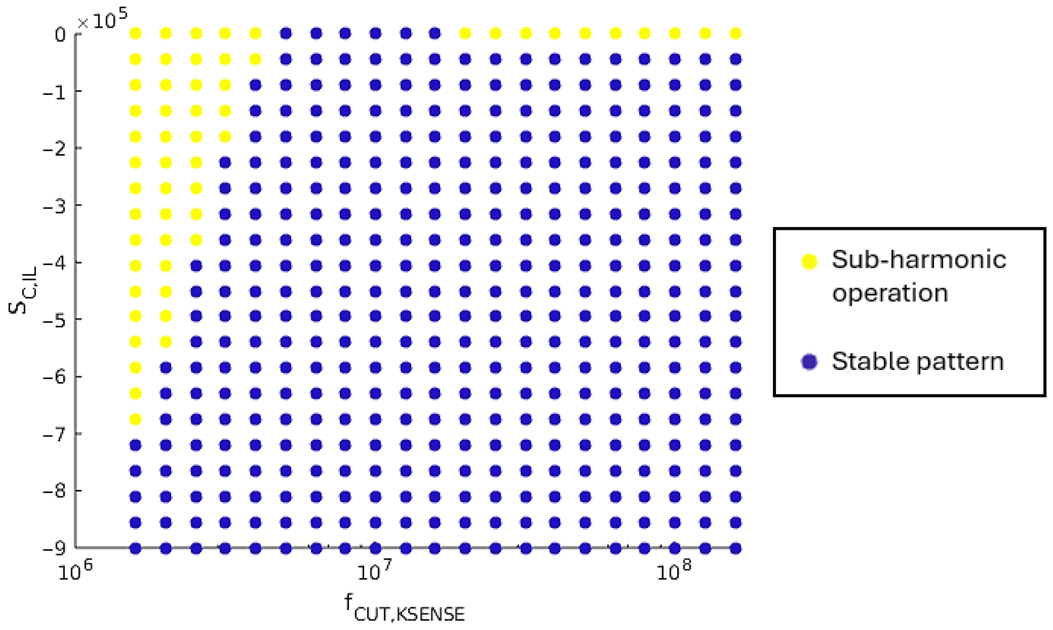 This boundary equation is verified through simulation. The supply voltage, , varies in the range [1.6 V; 3.6 V] with a 100 mV step. The compensation ramp slope, , varies between 0 V/s and 9·105 V/s. The maximum value for this slope corresponds to an amplitude of 300 mV with 3 MHz switching frequency of the SIMO converter. Figure 13 shows the obtained results. For a given set of (, ), a yellow point means that at least one load case is leading to sub-harmonic oscillations, while a blue point means that a stable operation pattern is achieved by the SIMO converter for all load cases in Table 2.