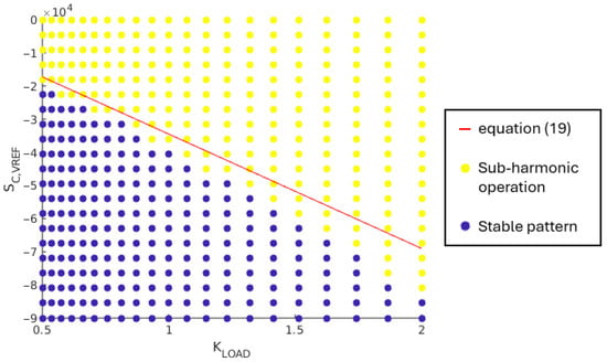 The load case #3 corresponds to the most critical case regarding the compensating ramp slope needed. For this case, the stability condition in (6) is not satisfied and the boundary between stable operation pattern and sub-harmonic oscillations is given by the inequality in (17). Doing the numerical application in this stability condition for the load case #3 and considering the nominal values for circuit parameters, the boundary between stable pattern and sub-harmonic oscillations is rewritten as (19):
