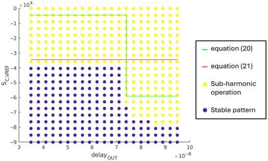 When considering the comparators in the output switches’ control loops and their propagation delay, , the condition of existence of a stable pattern without sub-harmonic oscillations, as described by the inequality (4), can be reworked as (6) using the slope expressions, and , from Figure 8b: