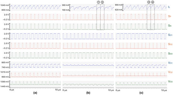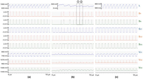 Sub-harmonic oscillations are visible on the inductor current waveform: as an example, the valley current is different between the two consecutive switching cycles (1) and (2) that are identified in Figure 4. The issue is characterized by alternating narrow and wide pulses on the switches’ signals and , and the duty cycles of the switches are not the same from one period to the next.