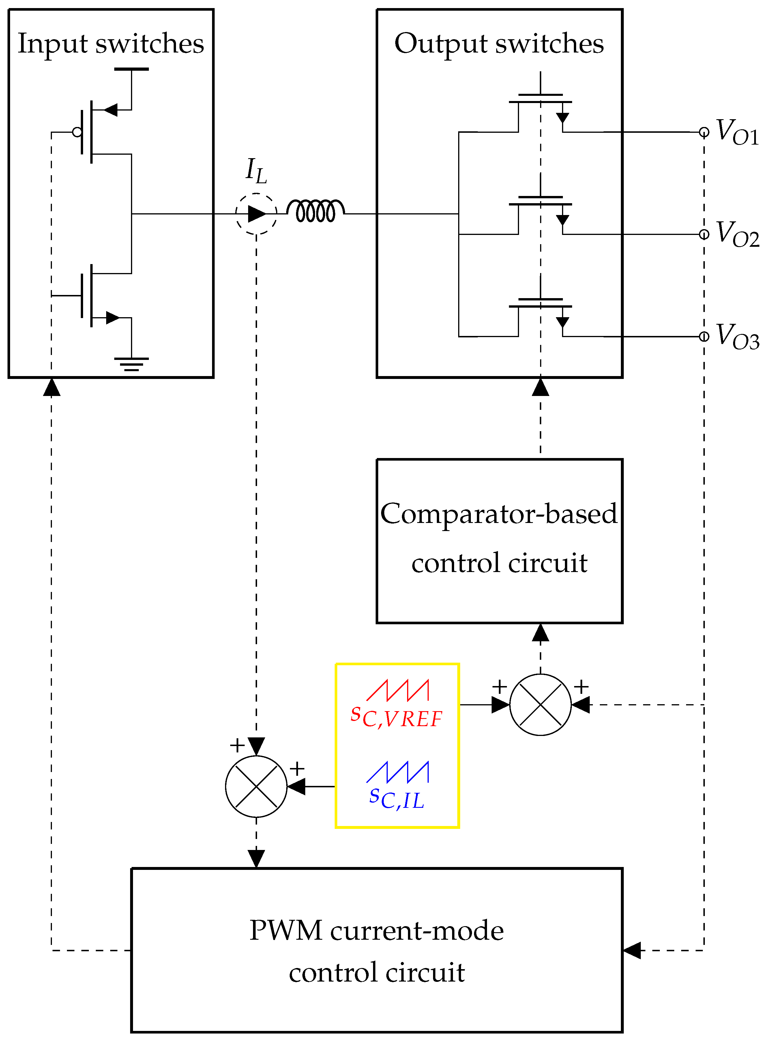 However, the control strategy presented in this article has two different control loops: a current-mode control loop for the input switches and a comparator-based control loop for the output switches. This configuration has the advantage of minimizing the cross-regulation phenomenon compared with conventional control strategies. The drawback is that subharmonic oscillations can occur because of parallel control loops. Thus, a solution is proposed with double slope compensation, one for each control loop.