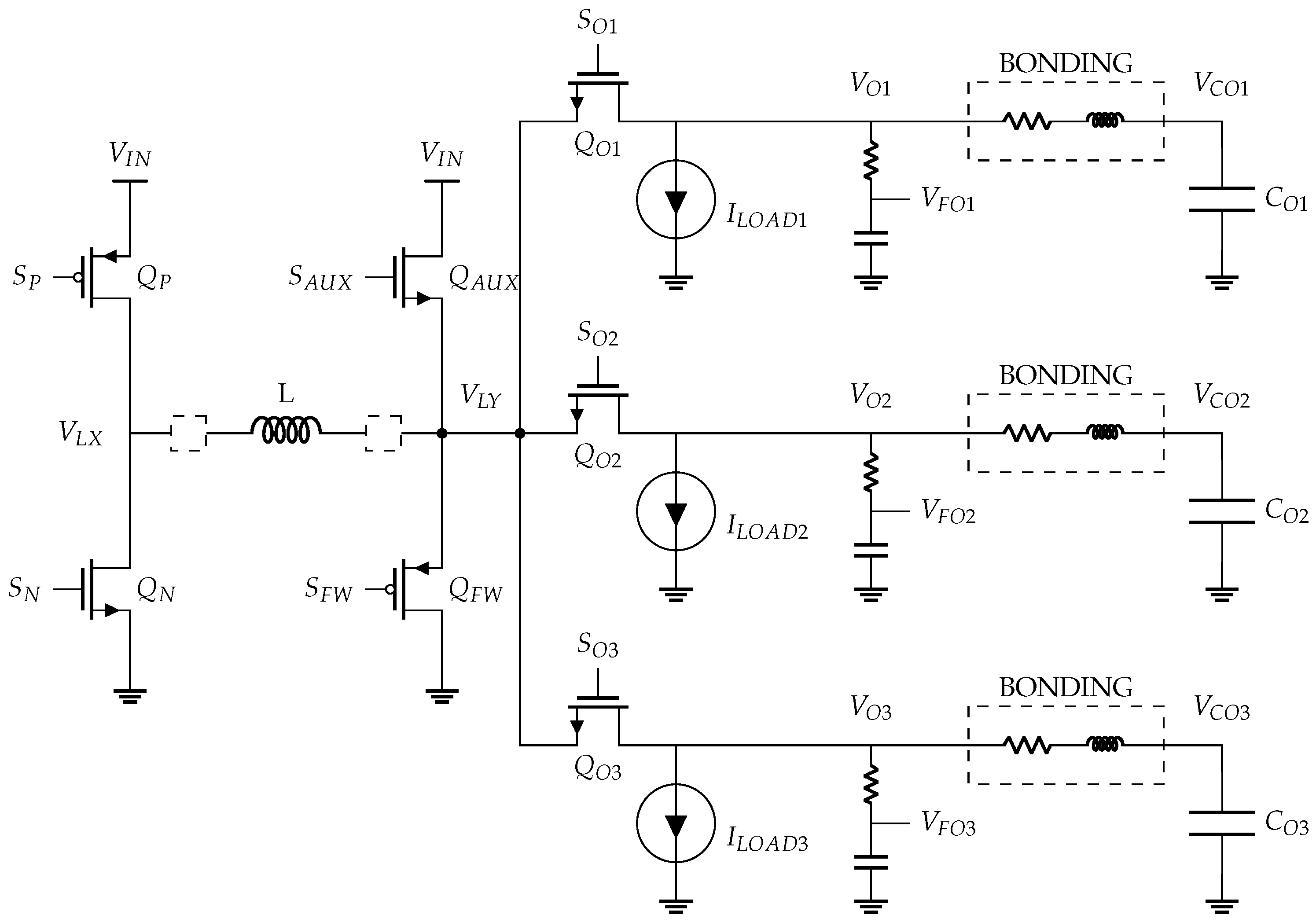 3-output SIMO DC-DC converter power stage.