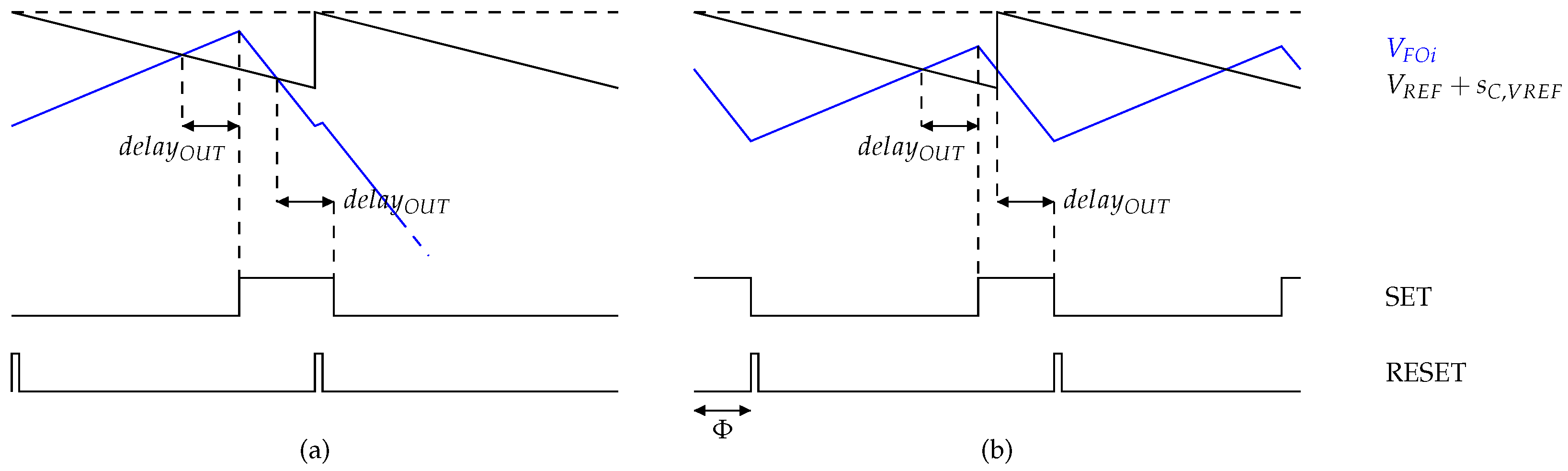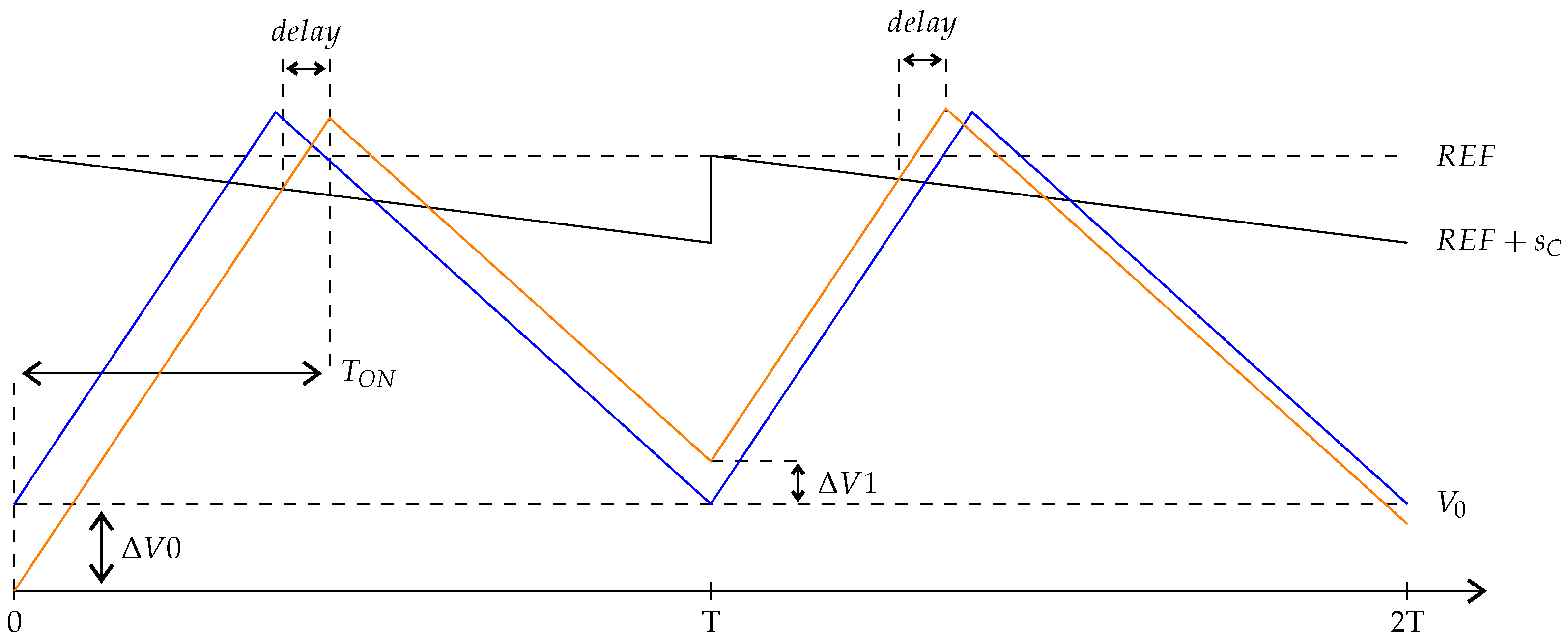 - For each output switch, REF refers to the output reference voltage, , the compensating ramp, , corresponds to a ramp of slope, , the delay corresponds to the propagation, delay of an output comparator, and the signal corresponds to the sensed output voltage, .