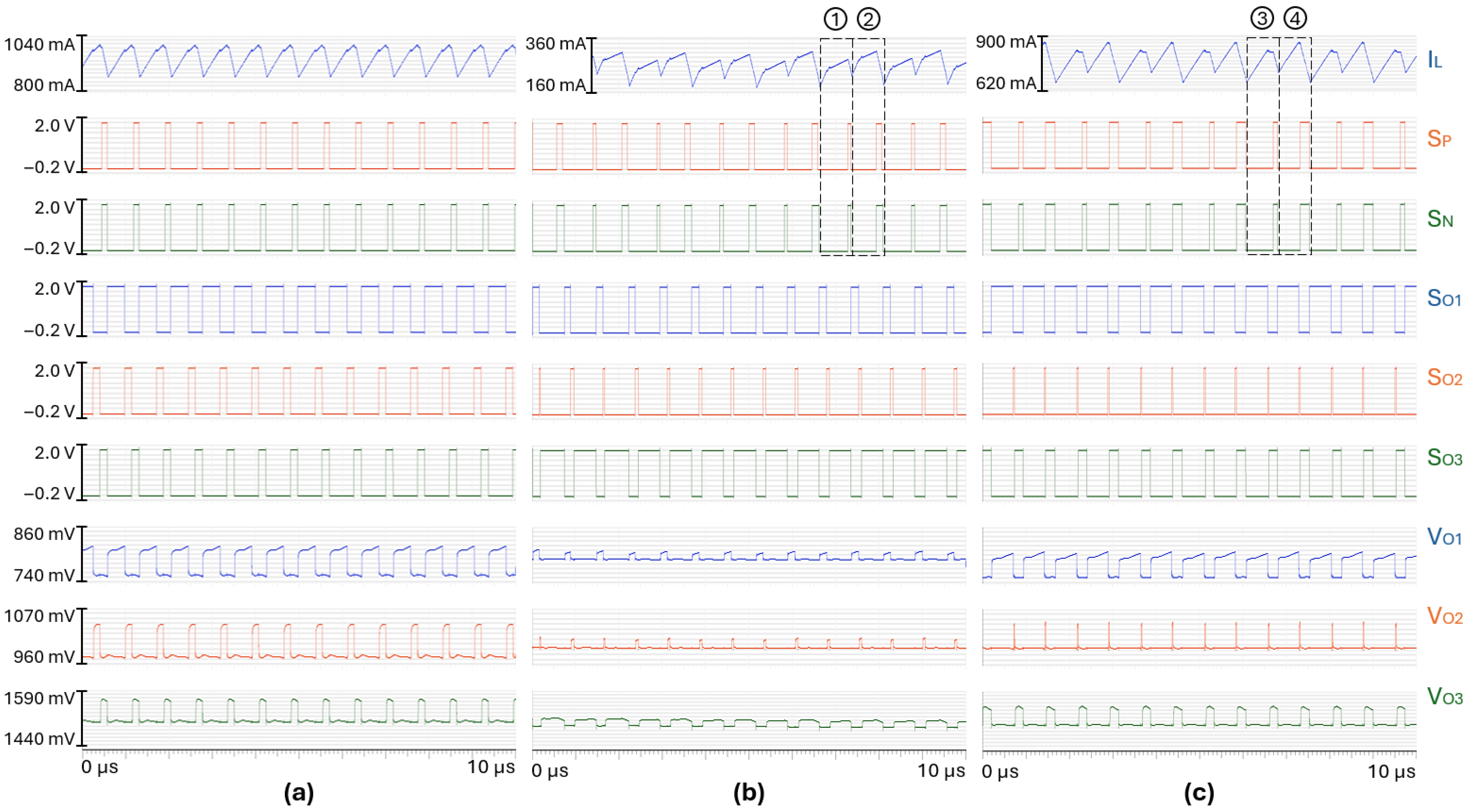 Figure 19 shows the waveforms obtained with set to 8.3 V/s and set to 6.0 V/s. Based on the previous section, this set of compensating ramp slopes should damp any tendency toward sub-harmonic oscillations. However, a stable pattern is only achieved for the load case #1 as shown in Figure 19a. For the load cases #7 and #3, respectively shown in Figure 19b and Figure 19c, period doubling occurs. Between the two consecutive switching cycles ➀ and ➁, the valley current is different, as well as the duty cycles of the input switches. The same observation is done between the two consecutive switching cycles ➂ and ➃.