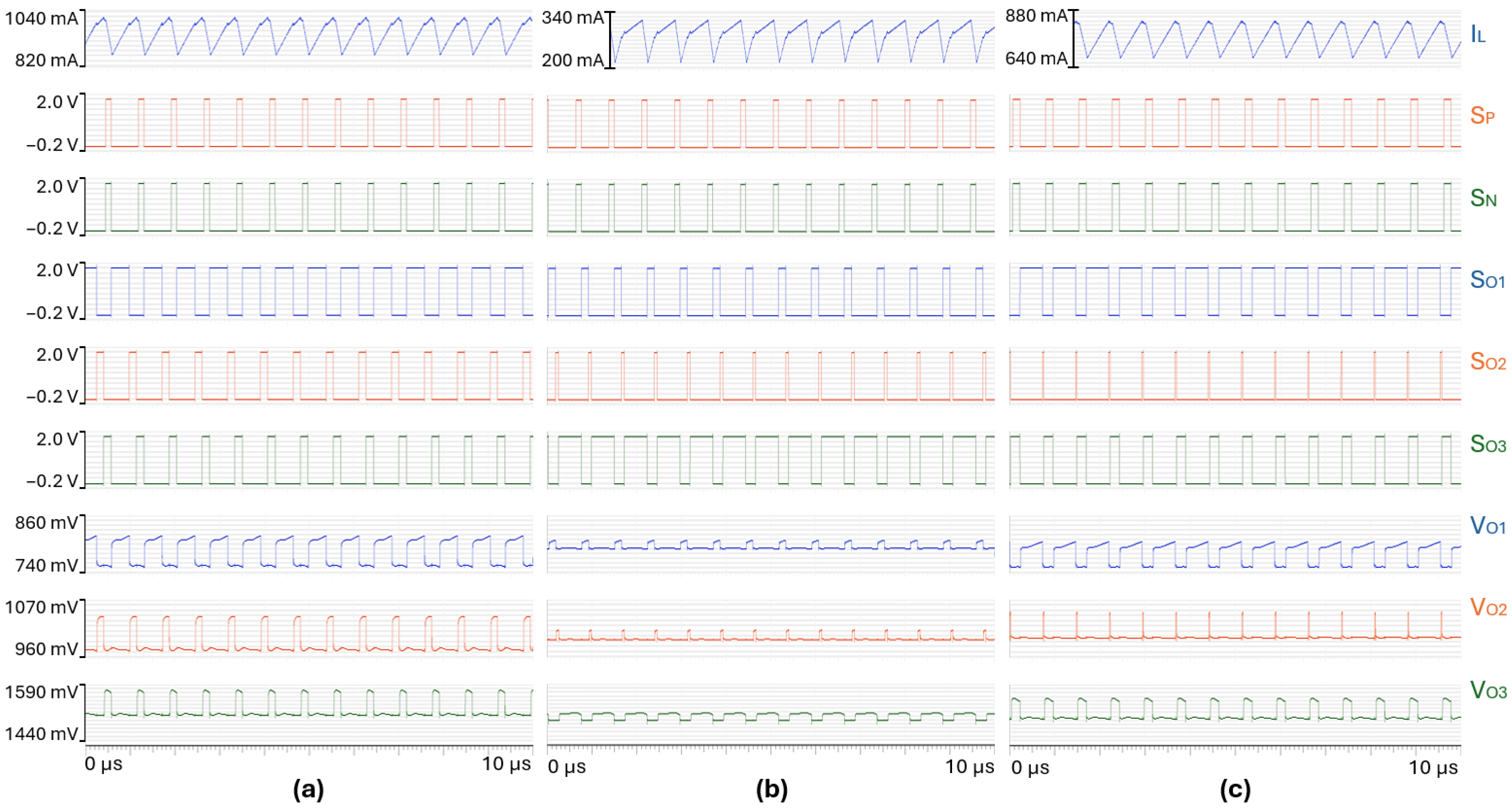 Steady-state waveforms achieved in (a) load case #1, (b) load case #7, (c) load case #3, for = 9.6 V/s and = 5.0 V/s.