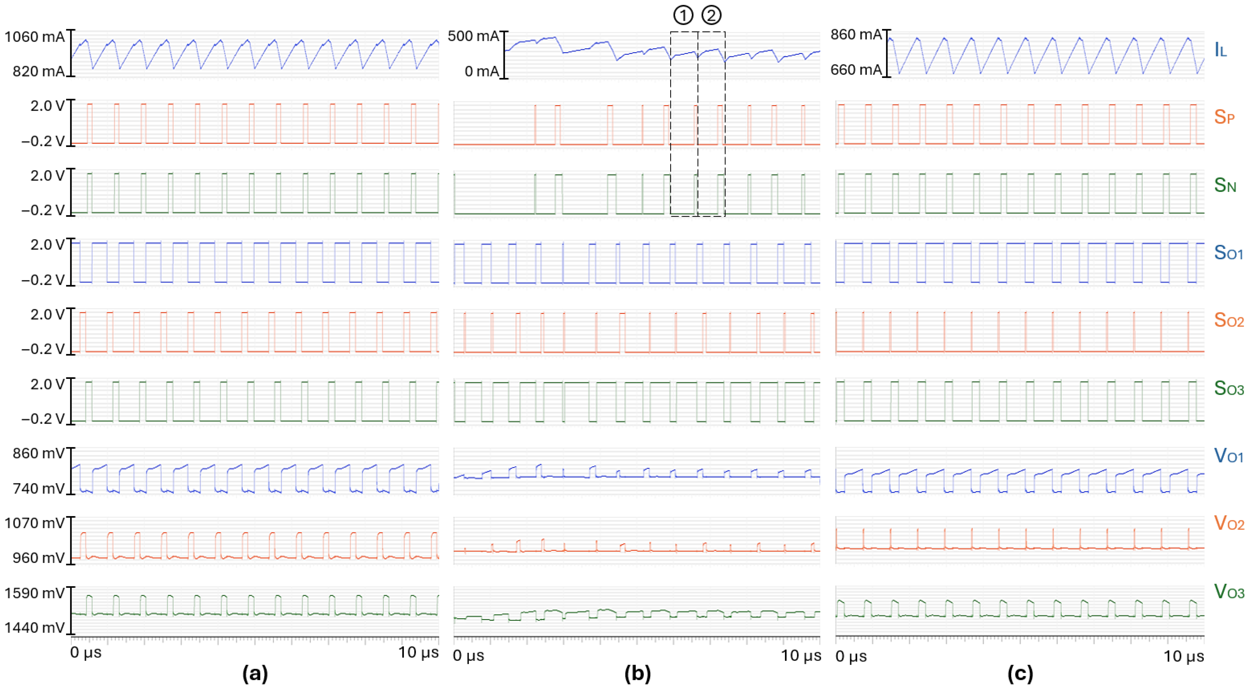 The output voltage waveforms are also 2T-periodic rather than T-periodic. For the whole switching cycle ➀, only the first output is supplied. Then, all outputs are supplied during the switching cycle ➁, and this pattern repeats itself. However, the mean duty cycle of the input and output switches, over multiple periods, remains constant: the average inductor current is equal to the sum of output current loads on average and is correctly split between both 3 outputs. Thus, outputs are still regulated to their reference voltages. However, the phenomenon is not suitable as it is not controlled.