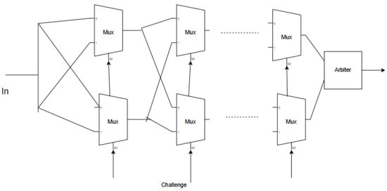 The Arbiter PUF is a type of physically unclonable function that operates based on delay variations. Arbiter PUF structure is shown in Figure 1. The Arbiter PUF consists of 2-to-1 multiplexers and a D flip-flop, which functions as an Arbiter. For an n-bit Arbiter PUF, multiplexers will be connected as illustrated in Figure 1. The challenge bits are utilized as select lines for each multiplexer. Variations in manufacturing can lead to delays in input arrival times to the D flip-flop, resulting in unpredictable outputs. This randomness in the PUF response makes it challenging for attackers to anticipate, allowing it to be effectively used as a key for cryptographic applications in IoT and embedded systems [1,5,6].
