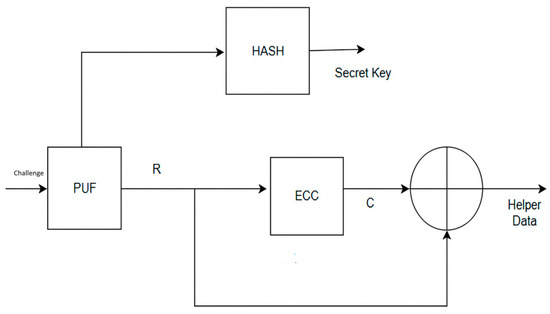 PUFs can generate unique, unclonable cryptographic keys for authentication and secure communication, making them suitable for applications in 5G networks [5,6,7]. Environmental factors can lead to inaccuracies in the PUF response, resulting in a bit error rate that affects its reliability. This bit error rate can be mitigated by implementing an error correction coding technique for the PUF response [8,9,10,11,12,13].