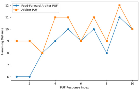 Comparison of Hamming distances for Arbiter PUF and feed-forward Arbiter PUF across multiple response samples.