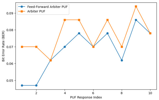 Bit error rate (BER) comparison between the Arbiter PUF and the feed-forward Arbiter PUF across multiple response samples.