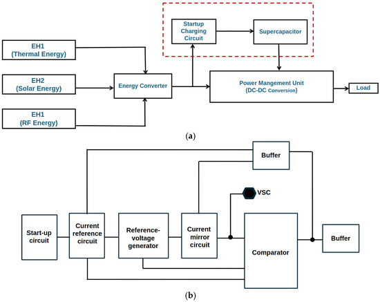 Figure 1 illustrates the role and architecture of the proposed self-contained charging circuit within an energy-harvesting system. Figure 1a shows a system-level diagram where multiple energy sources (thermal, solar, and RF) are funneled through an energy converter to power a load. The proposed startup charging circuit is used to charge a supercapacitor, providing a reliable energy buffer for cold-start conditions [5].
