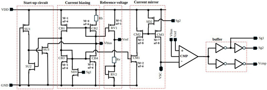 Figure 2 shows the simplified schematic of the proposed charging circuit. The start-up circuit transistors are labeled as SU1, SU2, and SU3, which provide the initial bias to the current-biasing circuit through the gate of SU2 and the drain of SU3. The current-biasing circuit generates the current reference for the entire block. The fixed DC reference voltage generated at the reference voltage is fed to the comparator circuit.