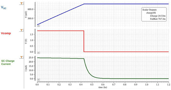 Circuit simulation was performed to verify the performance of the design while considering the target specification shown in Table 1. As part of the requirements, the design should operate in the AVDD minimum voltage of 0.9 V and up to the maximum supply voltage of 1.8 V. The charging current across the supercapacitor (SC) is expected to be from 1 mA to 50 mA, including worst-case conditions. The supercapacitor voltage (VSC) full charge should be from 700 mV to 900 mV.