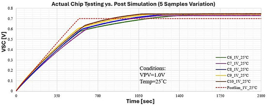 Supercapacitor voltage (VSC) measurement. Actual chip testing of 5 samples compared with post-simulation at 25 °C.