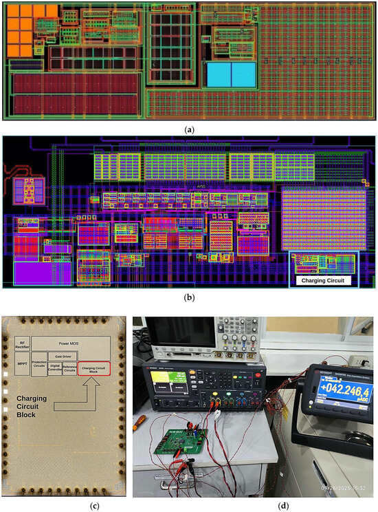 Figure 9a shows the layout of the charging core, designed and implemented in the 22 nm FDSOI technology. It highlights the transistor-level design of key components such as power switches, capacitors, and control circuitry, all optimized for efficient energy transfer. Figure 9b presents the full-chip layout, with the entire energy-harvesting system, including the charging circuit, occupying a total area of 1000 µm × 400 µm. The design is intended for packaging in a QFN40 (5 mm × 5 mm) package. This layout illustrates the system-level integration of the proposed charging circuit, including its connections to power management, energy storage, and control blocks, with routing carefully optimized to minimize parasitic losses. Figure 9c shows the chip die micrograph, illustrating the fabricated silicon layout of the charging circuit with visible pad placements and key functional blocks. Finally, Figure 9d shows the testing set-up with a DC power analyzer and a thermal chamber for performance validation and measurement.