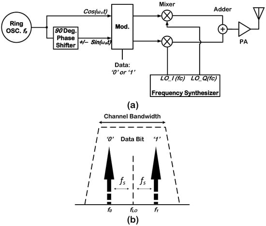 A wireless radio frequency (RF) transmitter of a digital communication system typically consists of a digital baseband, an analog front-end (AFE), and an RF front-end (RFFE), which are custom-designed based on the modulation scheme. Depending on the number of tones used during the communication and the distance between these tones, the FSK modulation can be classified as minimum shift keying (MSK), two-level frequency shift keying (2LFSK), four-level frequency shift keying (4LFSK), and multitone FSK [20]. A conventional FSK transmitter diagram is shown in Figure 1. The binary ‘0’ is encoded to the lower frequency as fLO − ∆f and the binary ‘1’ is encoded to the higher frequency as fLO + ∆f. The quadrature LO signals are generated by a frequency synthesizer, while the fs signal is generated by a ring oscillator. For MSK, the deviation, fs, must be at least half of the bit rate for the reliable detection [20]. Considering the fact that cos(2π∆f⋅t) produces the same output with data ‘0’ or ‘1’, while sin(2π∆f⋅t) changes its sign with data ‘0’ or ‘1’, we can list the two tones in FSK as cos [2π(fLO + ∆f)⋅t] and cos[2π(fLO − ∆f)⋅t] following the equation below: