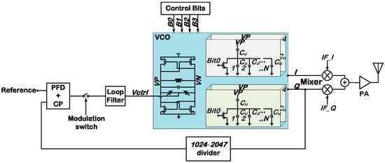 The block diagram of the proposed secure FSK transmitter front-end is shown in Figure 3. The proposed design includes control units, a phase-locked loop (PLL) with a controllable VCO, mixers, and a power amplifier (PA). After the PLL calibrates the free-running frequency of the VCO by connecting the modulation switch, the control units tune the frequency of the VCO to modulate the signal, and I and Q signals are fed to mixers to drive the PA.
