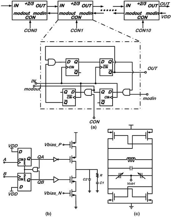 Detailed schematics of the PLL: (a) 1024–2047 divider, (b) PFD and CP, and (c) VCO.