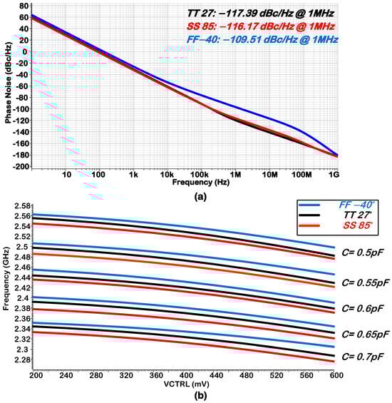 Figure 7a shows the post-layout simulated phase noise of the VCO under FF, TT, and SS process corners and extreme temperatures, with a maximum deviation of approximately 7.88 dB at a 1 MHz offset between the extreme cases. This limited variation indicates that process variations do not significantly impact the phase-noise performance, confirming the stability of the proposed architecture.