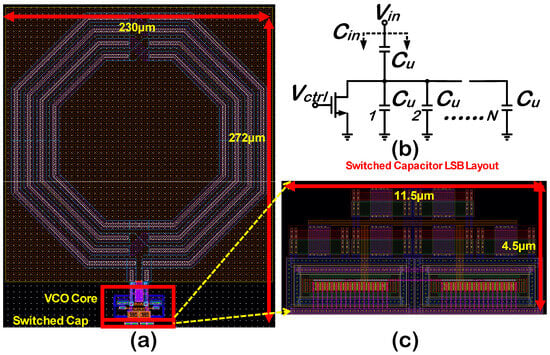 (a) Layout of the VCO with switched capacitor. (b) The schematic of the switched capacitor with (c) a zoomed-in view of its layout.