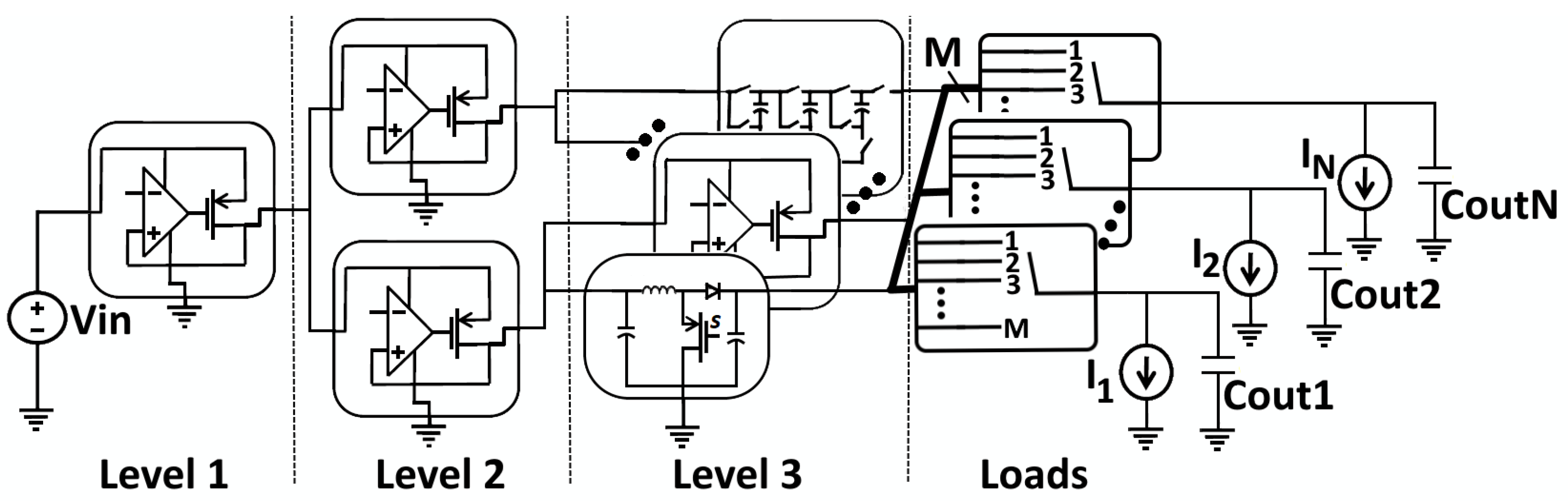 - Adaptive hierarchical PDU support: By effectively coordinating disparate DC–DC converters and power gating, the proposed method achieves significantly higher total efficiency across different supply voltages compared to single-converter systems.