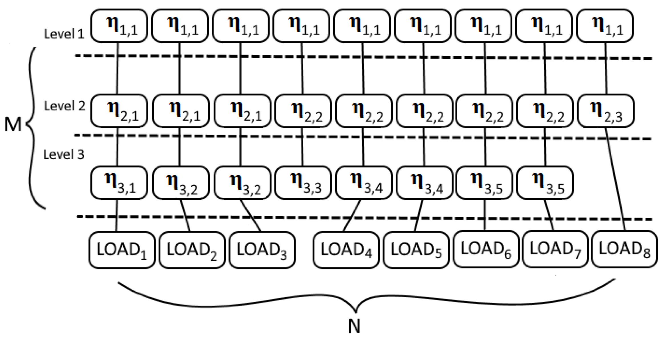 | (Total) end-to-end power efficiency | The overall power efficiency for L loads connected to the system. |
