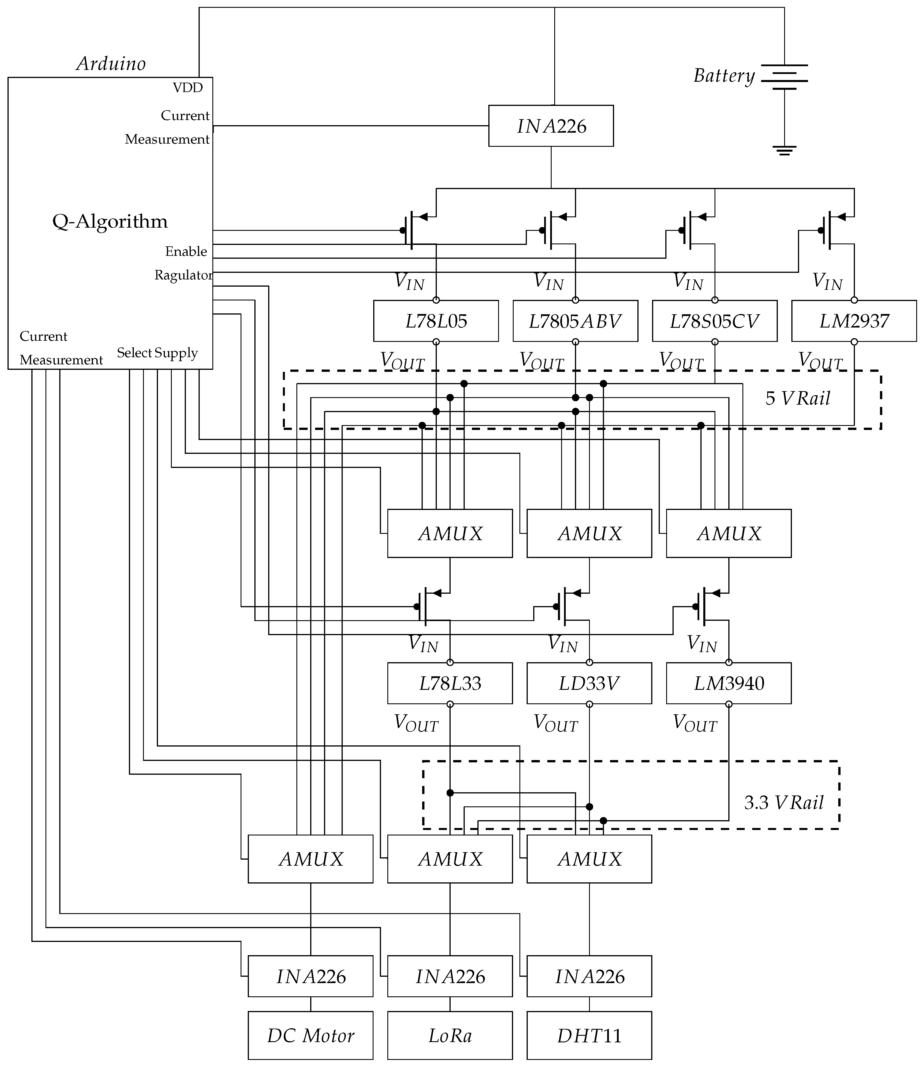 - Action (): Corresponds to the digital control signals and sent by the Q-agent (e.g., Arduino Due) to the PMOS transistors and AMUXs. These signals physically reconfigure the circuit topology by enabling/disabling a specific regulator or connecting/disconnecting a to/from a regulator.