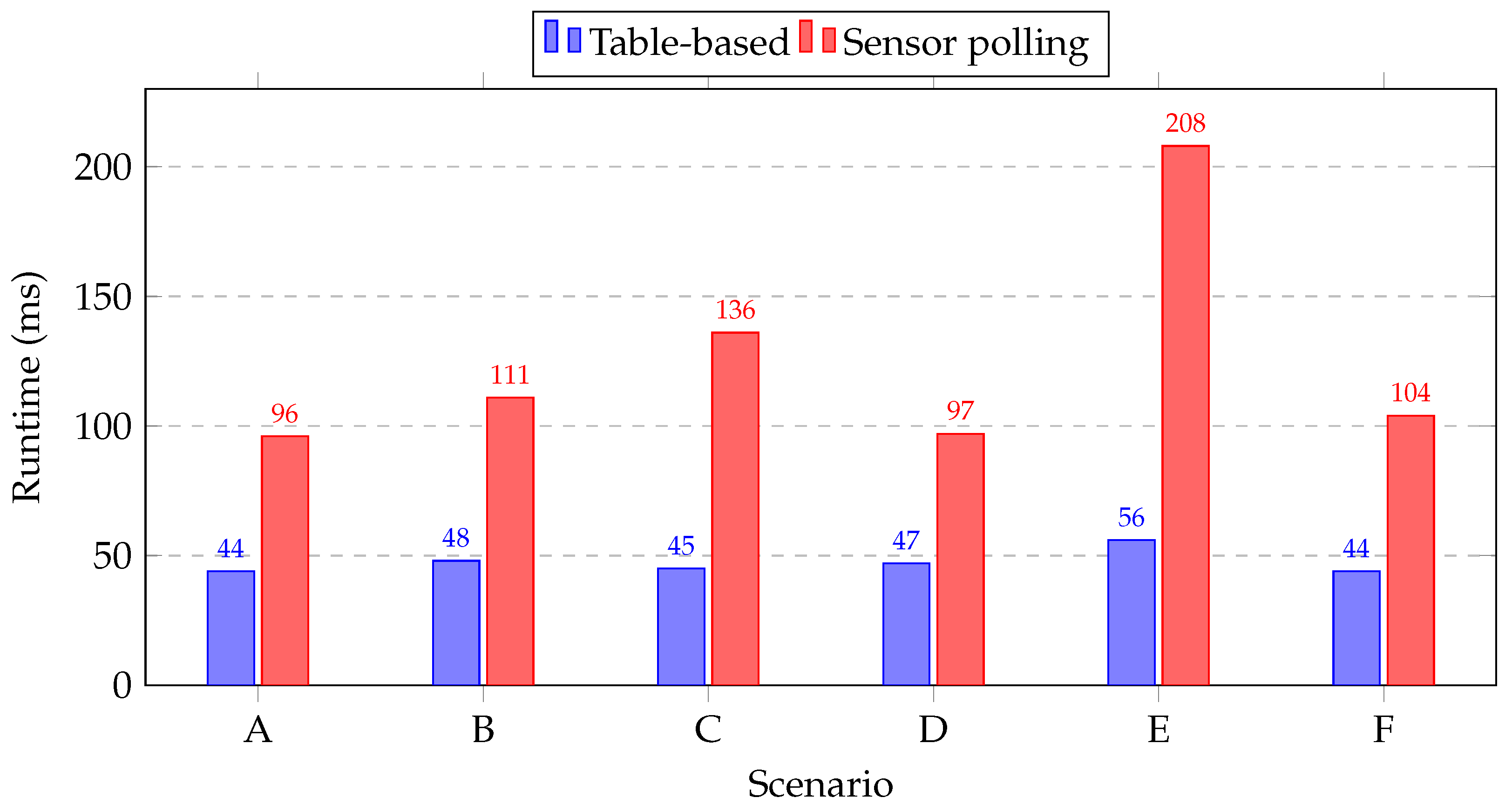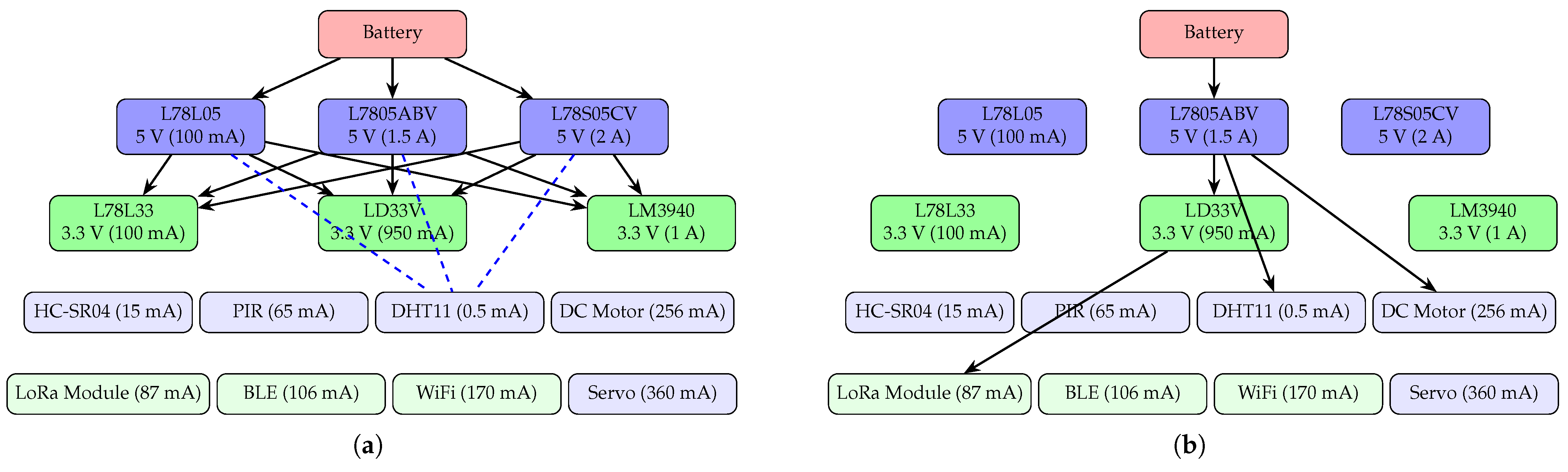 - Low overhead: By utilizing a derived formula for power efficiency that relies solely on measured load currents and a pre-characterized regulator lookup table with quiescent current data, the system eliminates the need for continuous sensor polling. This approach significantly reduces the computational cost, improving runtime from 208 ms (sensor polling) to 56 ms (table-based) in high-density-load scenarios. This low overhead is highly appropriate for portable systems.