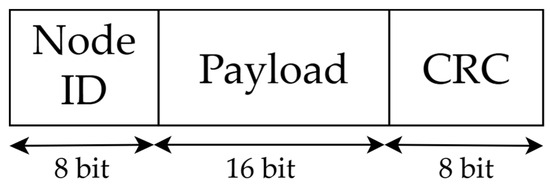 As shown in Figure 2, each node is identified on the packet by an 8-bit field; hence, this WSN is designed to contain up to 256 nodes. Since data has both an integer and a decimal part, the payload field of the custom LoRa-P2P packet has a 16-bit size and contains the node data converted to hexadecimal format to represent it with sufficient precision. Finally, the packet is counter-verified using the Cyclic Redundancy Check (CRC). Its content is based on the “x8 + x2 + x + 1” polynomial, with a size of 8 bits to ensure sufficient data integrity, since the system needs a significant number of nodes.