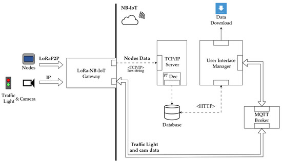 As mentioned above, the system features a custom architecture regarding the interfacing between system objects. In particular, as depicted in Figure 3, the LoRa-NB-IoT gateway data can be classified into two types, which differentiate into two different paths: data from nodes, and data from traffic lights and video cameras.