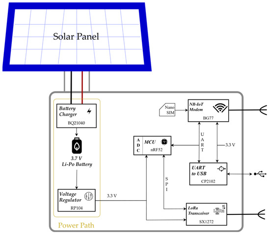 As shown in Figure 6, the LoRa-NB-IoT gateway node is powered by a solar panel mounted on the same support pole. The current from the solar panel is managed by a BQ21040 battery charger to charge a Lithium Polymer Battery, whose charge level is read by the central MCU. Additionally, the voltage provided by the battery is regulated to 3.3 V through the RP104 voltage regulator, delivering a constant voltage supply for the other circuit components.