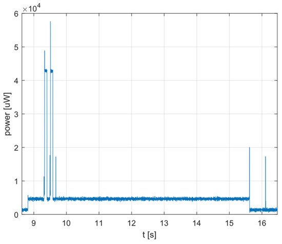 Since the system is classified as autonomous, with supply independence being one of its key features, this section reports the measurement of its power consumption during transmission and in idle mode. Specifically, measurements are executed using a Texas Instruments INA229 current monitor circuit. As per the datasheet [36], a 40 mΩ shunt resistor has been chosen for the measurement. As a result, Figure 7 reports the power consumption during a packet transmission procedure.