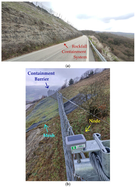 In particular, as shown in Figure 8a, the proposed rockfall containment system is installed on a rural slope above the road, facing a valley, while, as indicated by Figure 8b, the proposed system is composed of a containment mesh, whose anchor points host several inclination nodes to monitor the slope changes of the area in a grid-alike configuration; the entire system is delimited by a rockfall containment barrier, whose pillars host several nodes, in case of solid rocks incoming from the above area.