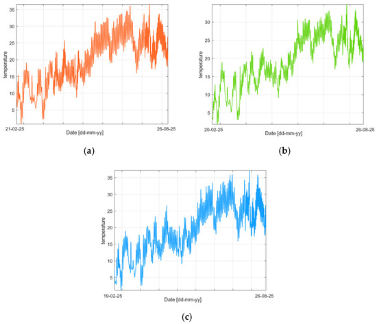 The temperature, reported in Figure 9a–c, clearly shows the drift from winter to summertime, with several maximum and minimum points resulting from brief rainfall periods registered within the time window of interest. In particular, a minimum of around 0 °C is reached in the February period, while a maximum of 35 °C is reached in the August period.