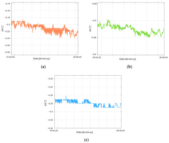 As a result, recorded inclinations are constant in almost all nodes, similar to the trend of node 35 (Figure 11c), where the inclination variation oscillates between −0.27° and −0.29°; nevertheless, some nodes experience a mild decreasing trend, linked to the morphology of the territory, as mentioned in the previous section. In fact, node 30 (Figure 11a) undergoes a decreasing inclination variation from −0.17° to −0.24°, while node 33 (Figure 11b) experiences a drift in the same value, from −0.3° to −0.35°.