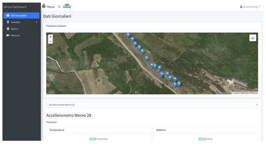 The user interface was designed to ensure the maximum accessibility possible to the implementation data. As a matter of fact, Figure 12 reports the homepage of the user interface, which features the location of every active node in the area and shows the possibility of selecting a node to see its data.