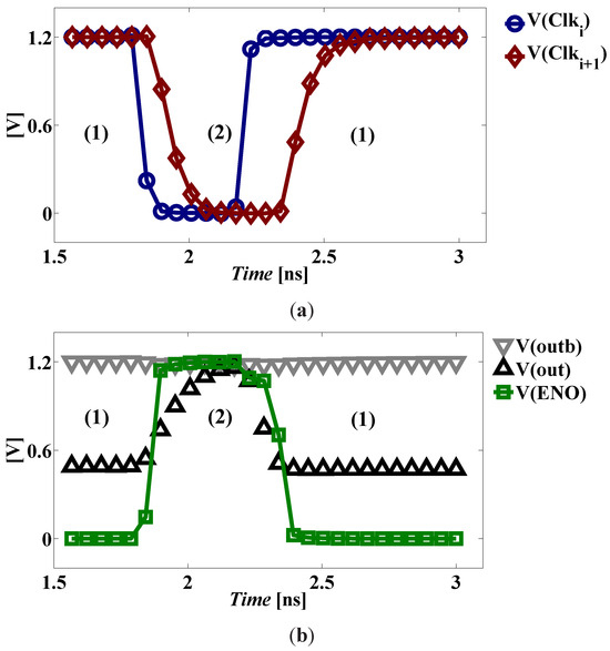 DDSLL XOR functional operation of (a) typical clocks and (b) signal traces at (1) the evaluation and (2) the precharge phases.