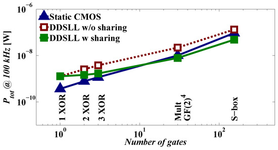 Since the principle of sharing the common blocks is generally applicable to differential CML, this section will demonstrate its effect on the power consumption of the DDSLL style only. Figure 7 shows the total power consumption of several blocks implemented using 2-input static CMOS and DDSLL with or without sharing versus the number of gates used by the 2-input static CMOS blocks. Simulations are done at typical conditions (VDD = 1.2 V, temperature = 27 ◦C, typical NMOS and PMOS transistors) without adding the extracted routing parasitics (only gate capacitances are accounted for). It can be seen that the total power consumption of a single DDSLL XOR gate is almost 3× higher than that of a 2-input static CMOS XOR gate. Therefore, if DDSLL gates are implemented without sharing the common blocks, the power consumption is kept higher than that of the corresponding 2-input static CMOS blocks as seen for example in the case of the S-box. However, if the principle of sharing is applied to the DDSLL gates, then the power consumption tends to be lower than that of the 2-input static CMOS as the number of gates increases. As a result, the DDSLL S-box that uses the sharing principle consumes 2× less power than the 2-input static CMOS S-box and 2.7× less power than that without sharing. Knowing the fact that a 4-input static CMOS complex gate would have reduced dynamic and static power consumptions with respect to its 2-input static CMOS implementation, simulation results are conducted on the 4-input static CMOS S-box and its total power consumption is 24% less than the 2-input static CMOS implementation. If the power of the DDSLL S-box with sharing is compared to that of the 4-input static CMOS S-box, the reduction will be a factor of 1.5× (instead of 2× if compared to the 2-input static CMOS S-box). However, the power reduction brought by the principle of sharing in the DDSLL style is evident regardless of the static CMOS implementation.