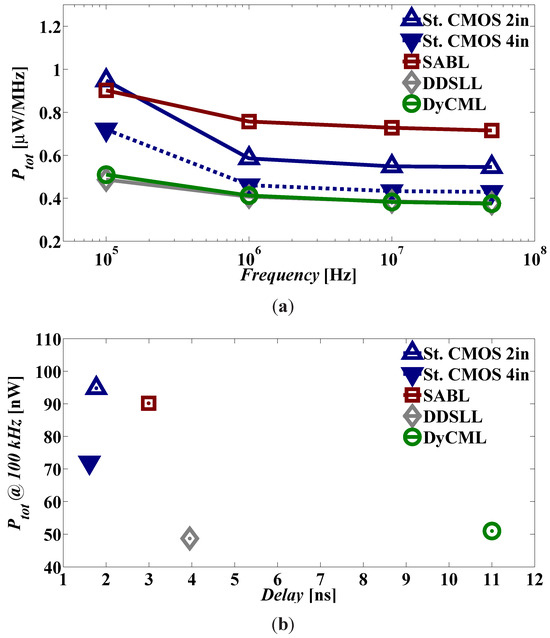 Concentrating on the power consumption of the AES S-box at 100 kHz versus the delay, Figure 8(b) shows that the DDSLL is the most suitable logic as it has a 2× and 1.5× reduction in power consumption compared to 2-input and 4-input static CMOS, respectively and only a 2× increase in delay. DyCML also shows the same power consumption as DDSLL, but has a greater delay penalty which is 6× higher than that of the two static CMOS versions. On the other hand, the SABL S-box consumes almost the same power as 2-input static CMOS with a 70% increase in delay.