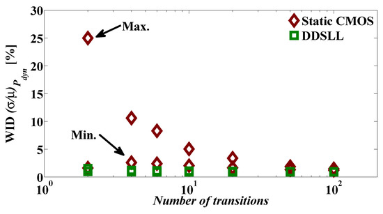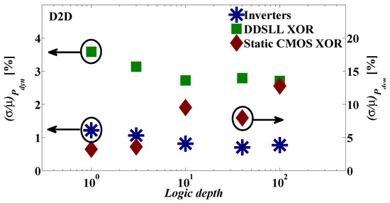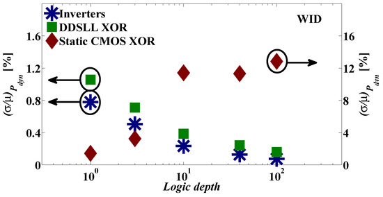 Now, in order to take the effect of αF on the WID variability into account, a static CMOS XOR chain with different logic depths is studied. Here, the two inputs of any XOR gate in the chain are driven by the output of the previous gate and the same input as the first XOR gate in the chain to magnify the WID αF variability. First, the sources of αF are identified as topology, signal statistics and spurious transitions or glitches associated to delay skew and logic depth [47]. Consequently as the logic depth increases, the delay skew between the two inputs of an XOR gate in the chain increases, generating random glitches, hence αF variations. As a result, the WID variability of the (αF .CL) term in Equation (1) is no longer decreasing with the increase of logic depth, but it actually increases as shown in Figure 9. Contrarily, the Pdyn WID variability of the DDSLL XOR chain decreases as the logic depth increases as shown in Figure 9 in accordance with the case of the inverter chain, thanks to having a deterministic αF , as it is glitch-free thanks to the self-time operation.