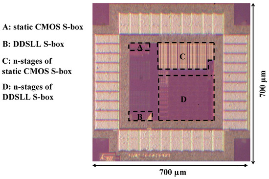 Figure 12 shows the microphotograph of the test chip which has been fabricated using a 65 nm low-power (LP) CMOS technology. The test chip comprises two blocks consisting of stand-alone S-boxes for power consumption measurements in static CMOS (block A) and DDSLL (block B) logics. Also to measure the delay performance of both logic styles, two blocks consisting of 34 stages and 40 stages of chained S-boxes in static CMOS (block C) and DDSLL (block D) styles, respectively are realized.