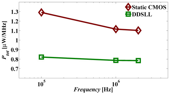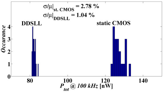 As a result, for low-power constrained applications such as RFID and smart cards, the impact of variability on the dynamic power plays an important role. In the case of high yield, the typical Pdyn+3σ should be less than the allocated power budget (dynamic). For a worst case scenario, a 2-transition input pattern is considered. For static CMOS, if the typical Pdyn at 100 kHz is 108 nW (as shown in Table 3) and the worst case σ is 27 nW (derived from Figure 11), then the typical Pdyn + 3σ would be 189 nW. While for DDSLL, if the typical Ptot at 100 kHz is 96 nW (also shown in Table 3) and the worst case σ is 0.96 nW (also acquired from Figure 11), then the typical Pdyn + 3σ would be 95.9 nW. Clearly the advantage of DDSLL is seen where the process variability has limited effect on its power consumption (keeping its power consumption within the allocated budget) whereas this is not true for static CMOS since process variations can cause the typical Pdyn + 3σ to be almost 1.75× the typical Pdyn.