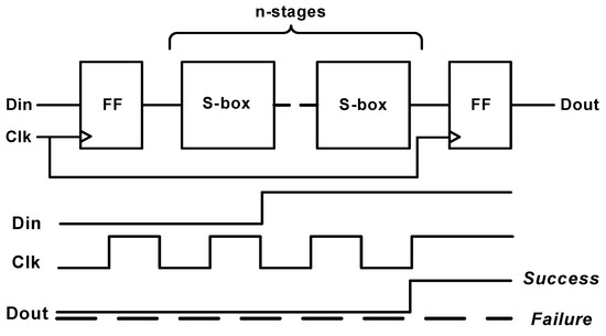 The delay of both S-boxes is measured over a chain of n-stages between two flipflops as this relaxes the requirements of the test equipment. Figure 15 shows the block diagram and the waveforms of the test bench used to measure the delay of either S-box. Here, two flipflops are clocked by the same Clk signal, where the one at the beginning of the chain is used to toggle a single transition in Din signal through the n-stages of the S-box chain and the other one at the end of the chain is used to capture the transition of the output of the last S-box in the chain Dout. By reducing the clock period to the same range of the chain delay, the output flipflop will not be able to sample the transition of the output of the last S-box in the chain due to setup time violation indicating that this clock period represents the delay of the chain. For the static CMOS S-box, the chain is constructed of 34 stages, whereas the DDSLL S-box chain consists of 40 stages.