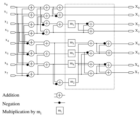 - Loeffler, C.; Ligtenberg, A.; Moschytz, G. Practical Fast 1-D DCT Algorithms with 11 Multiplications. In Proceedings of the 1989 International Conference on Acoustics, Speech, and Signal Processing (ICASSP ’89), Glasgow, Scotland, 23–26 May 1989; Volume 2, pp. 988–991. [Google Scholar]